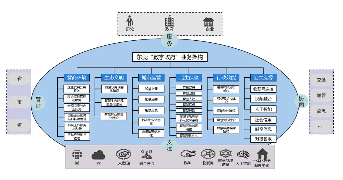 東莞市“數(shù)字政府”建設(shè)突破傳統(tǒng)業(yè)務(wù)條線垂直運(yùn)作、單部門內(nèi)循環(huán)模式,以管理、服務(wù)、協(xié)同和支撐為職能線,以營(yíng)商環(huán)境、生態(tài)文明、城市運(yùn)營(yíng)、民生保障、行政效能和公共支撐為業(yè)務(wù)線,構(gòu)建縱橫貫通的整體型“數(shù)字政府”業(yè)務(wù)體系。業(yè)務(wù)架構(gòu)圖如下所示: