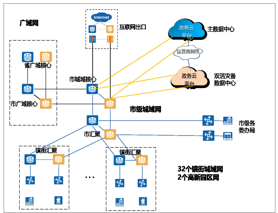 市政務(wù)外網(wǎng)通過市廣域核心節(jié)點(diǎn)向上聯(lián)接省廣域核心節(jié)點(diǎn),通過市城域核心節(jié)點(diǎn)聯(lián)接政務(wù)云中心和互聯(lián)網(wǎng)出口區(qū),再通過市匯聚節(jié)點(diǎn)聯(lián)接市級(jí)各委辦局網(wǎng)絡(luò)和鎮(zhèn)街匯聚節(jié)點(diǎn)。市城域核心、市匯聚、鎮(zhèn)街匯聚設(shè)備作為政務(wù)外網(wǎng)骨干設(shè)備,應(yīng)具備大容量,高性能,良好的擴(kuò)展性,支持 MPLS VPN、SRV6、SDN 等新技術(shù)。