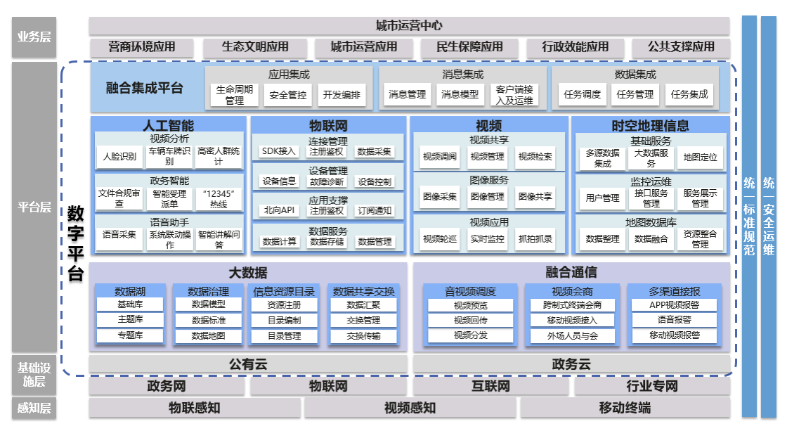 技術(shù)實(shí)現(xiàn)以數(shù)字平臺(tái)為核心,提供包括云計(jì)算、大數(shù)據(jù)、時(shí)空信息服務(wù)、視頻云、融合通信、物聯(lián)網(wǎng)、人工智能等能力,統(tǒng)一由能力開放平臺(tái)進(jìn)行服務(wù)發(fā)布和接口管理。