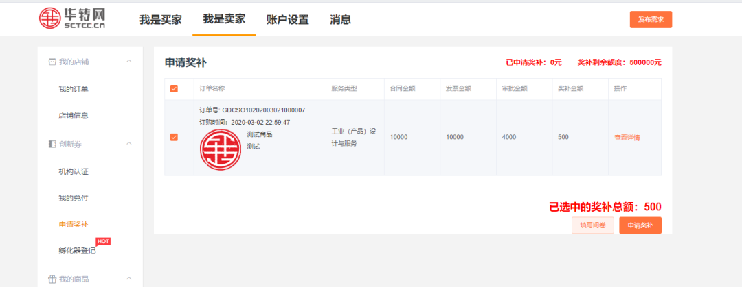 服務機構(gòu)登錄后,可在【用戶中心】--【我是賣家】---【申請獎補】對已兌付的訂單申請獎補。