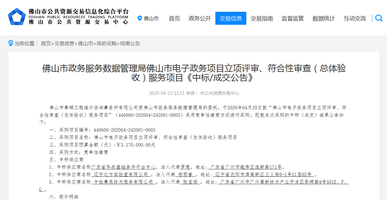 中檢賽辰技術(shù)服務(wù)有限公司(以下簡稱:賽辰)2020年4月22日以競爭性磋商方式優(yōu)勝其他同行競爭者,成功中標(biāo)【佛山市某某局佛山市XX項目立項評審、符合性審查(總體驗收)服務(wù)項目】。