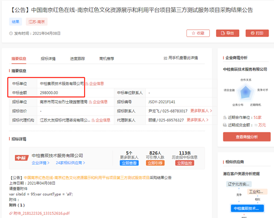 祝賀中檢賽辰技術(shù)服務(wù)有限公司(簡稱“賽辰”)成功中標(biāo)中國南京紅色在線-南京紅色文化資源展示和利用平臺(tái)項(xiàng)目第三方測(cè)試服務(wù)項(xiàng)目,中標(biāo)金額:298000元!