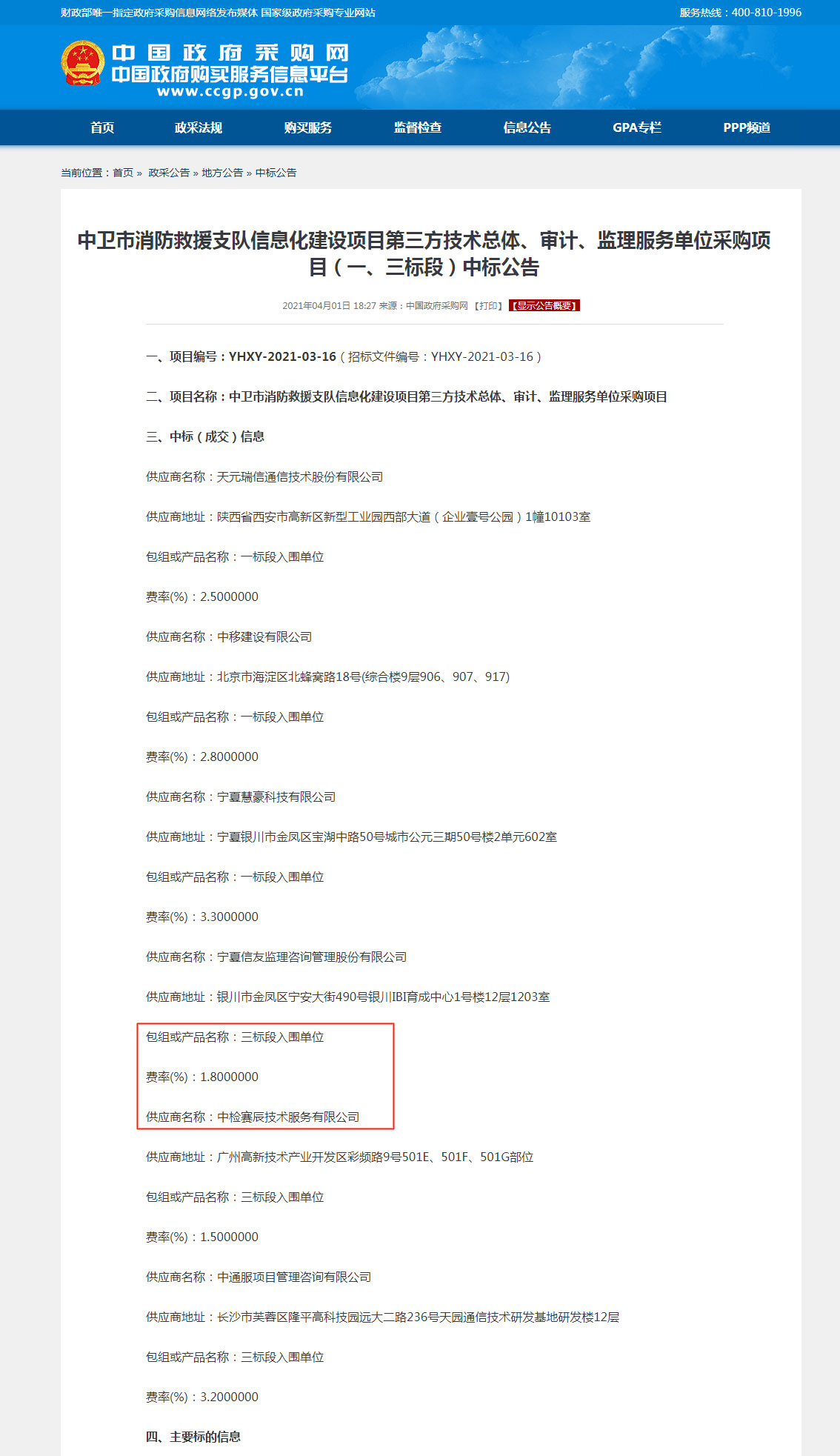 奮力開創(chuàng)!祝賀中檢賽辰技術(shù)服務(wù)有限公司(簡稱:賽辰)中標(biāo)中衛(wèi)市消防救援支隊信息化建設(shè)項目第三方技術(shù)總體、審計、監(jiān)理服務(wù)單位采購項目(三標(biāo)段入圍單位)。